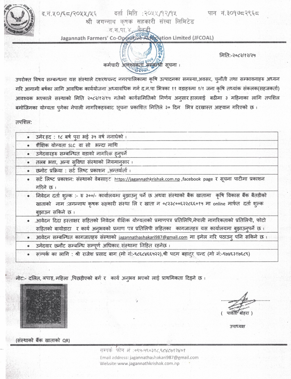 कर्मचारी आवश्यकता सम्बन्धी सूचना